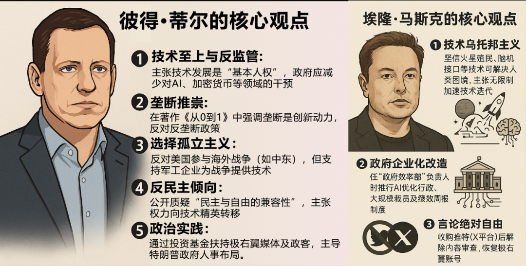 创建了Paypal的彼得·蒂尔(Peter Thiel),特斯拉的CEO和SpaceX的创始人埃隆·马斯克(Elon Musk)是大家熟悉的科技新贵,硅谷精英。他们质疑传统政府效能,相信技术进步能自动解决社会矛盾。主张技术至上、放松监管、自由市场竞争。