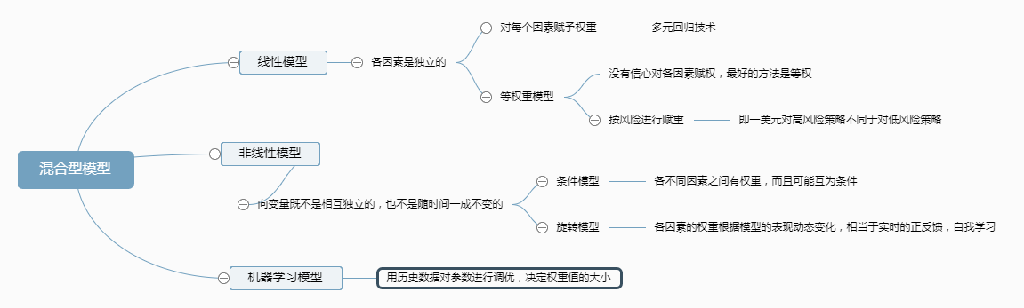 但是,这里的混合还有另外一重意思,就是,理论是一个,但是因子不同,比如线性模型,对每一个阿尔法因素赋于权重,然后用多元回归算法,混合各个阿尔法因素。