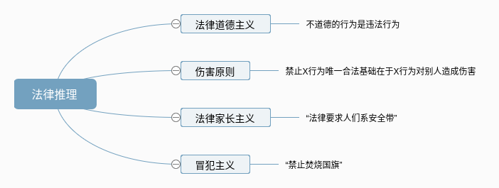 法律的证成:四个视角:法律道德主义、伤害原则、法律家长主义、冒犯性原则。