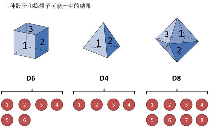 用最经典的例子,掷骰子。假设我手里有三个不同的骰子。第一个骰子是我们平常见的骰子(称这个骰子为D6),6个面,每个面(1,2,3,4,5,6)出现的概率是1/6。第二个骰子是个四面体(称这个骰子为D4),每个面(1,2,3,4)出现的概率是1/4。第三个骰子有八个面(称这个骰子为D8),每个面(1,2,3,4,5,6,7,8)出现的概率是1/8。
