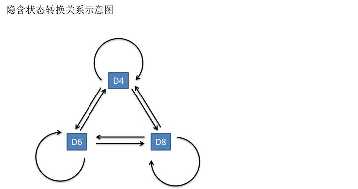 一般来说,HMM中说到的马尔可夫链其实是指隐含状态链,因为隐含状态(骰子)之间存在转换概率(transition probability)。在我们这个例子里,D6的下一个状态是D4,D6,D8的概率都是1/3。D4,D8的下一个状态是D4,D6,D8的转换概率也都一样是1/3。这样设定是为了最开始容易说清楚,但是我们其实是可以随意设定转换概率的。比如,我们可以这样定义,D6后面不能接D4,D6后面是D6的概率是0.9,是D8的概率是0.1。这样就是一个新的HMM。