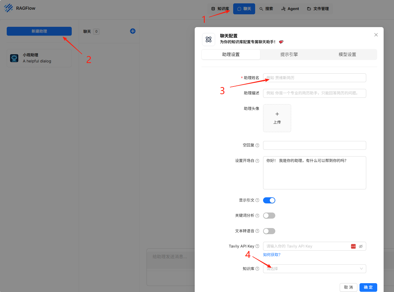 在3处自定义一个机器人名字,在4处选择刚才定义的知识库。 完成后,就可以点击助理名,和它聊天了。
