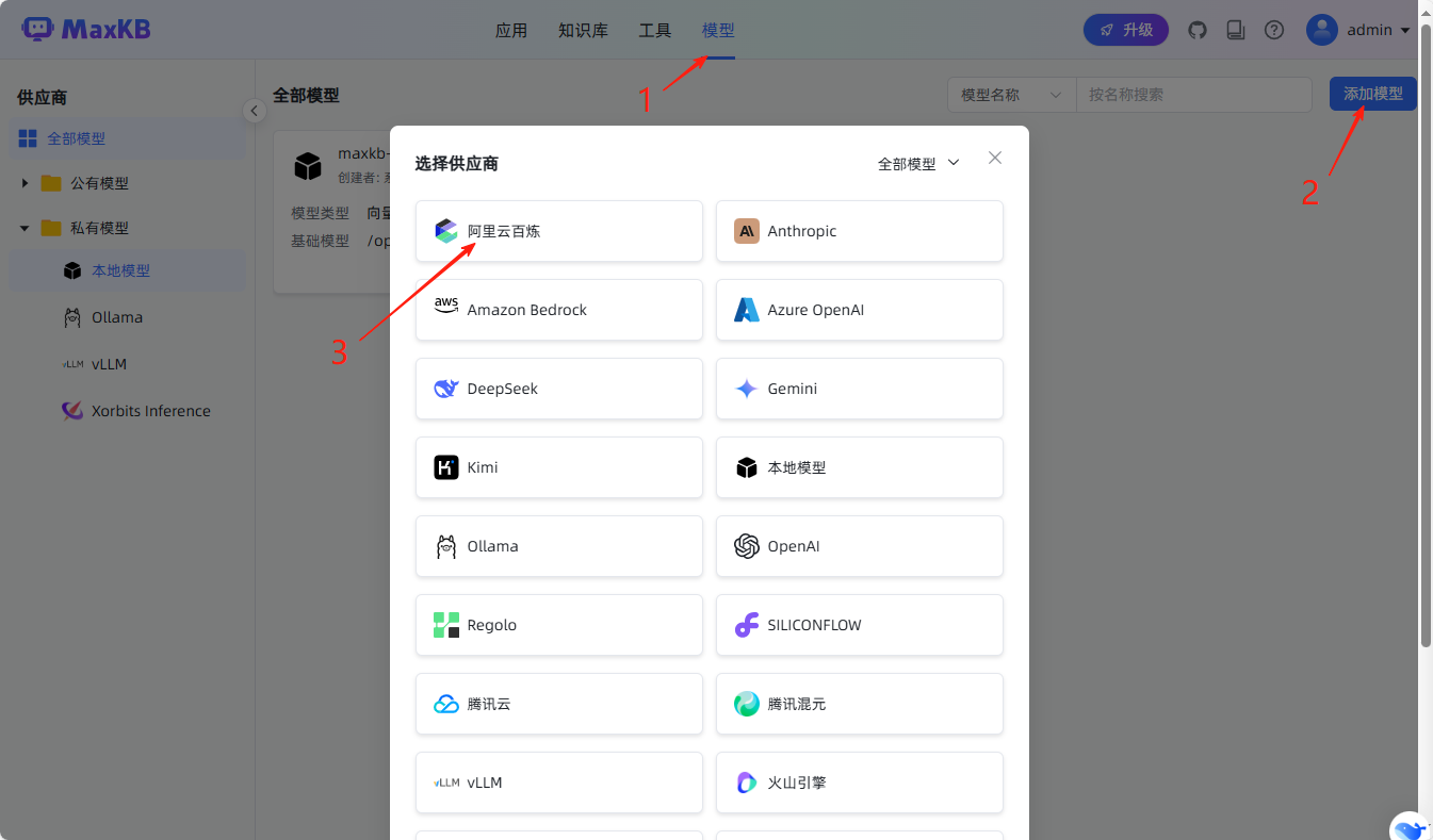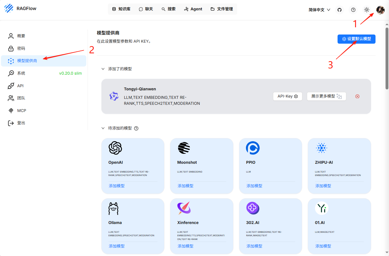 登录进入主界面后,直接从导航栏进入进行大模型配置。
