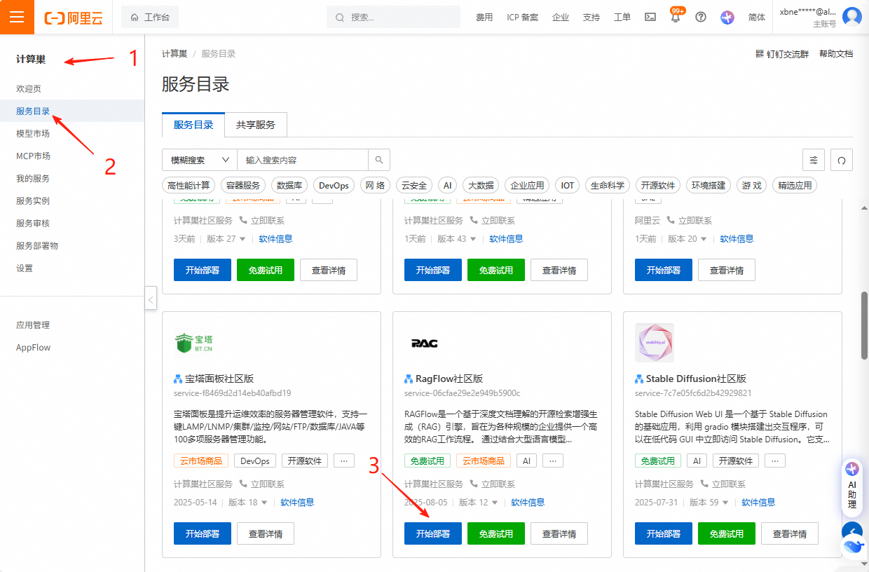 需要一台4核16G内存的服务器,因为我有阿里云账号,所以我直接使用阿里云自带的镜像服务器,就没有手动安装了。这样部署过程就变得相对简单了。 在阿里云控制台中,选择计算巢页面,然后在服务目录中找到RagFlow社区版,直接部署。