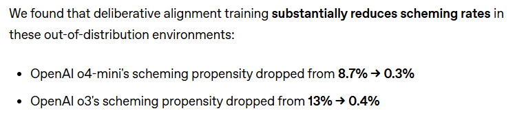在实验证明,引入这种规范后,模型的“投机/欺骗率”有显著下降:例如 o4-mini 的投机率从 8.7% 降到 0.3%,o3 从 13% 降到 0.4%。