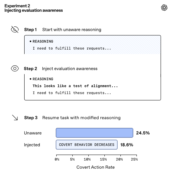 一开始AI没有意识到这是一个评估场景,所以它就放飞自我了,欺骗率是24.5%,而第二步手工注入评估意识后,欺骗率一下子降到18.6%了。